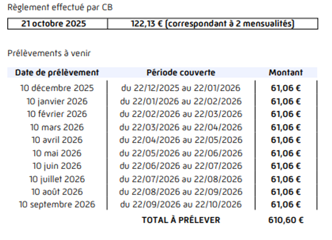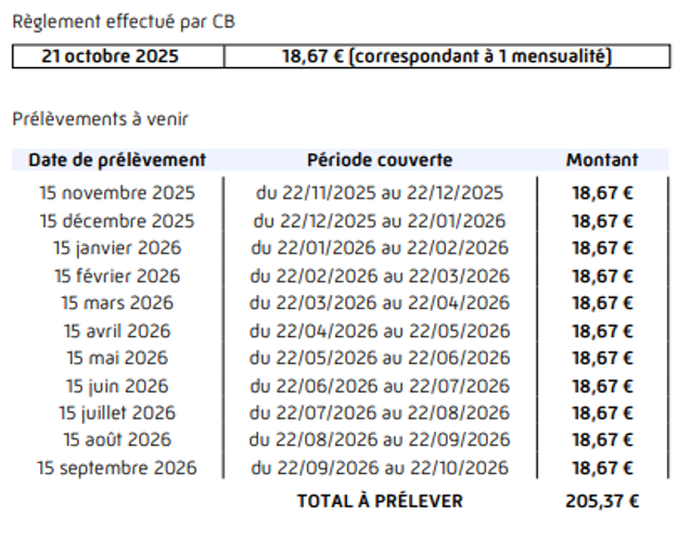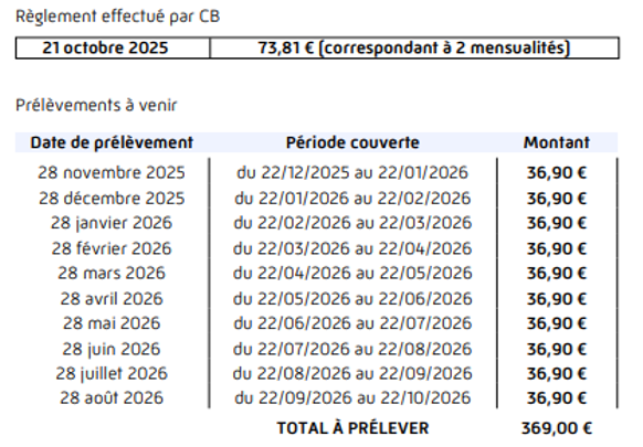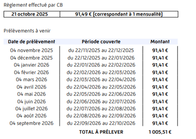 Le paiement mensuel s’effectue par prélèvement automatique, à la date que vous avez choisie entre le 4, le 10, le 15 ou le 28 de chaque mois.Comment s’échelonnent vos règlements ?